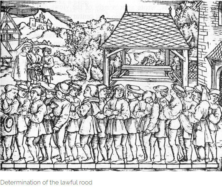 You find a standard of equal length, apply it repeatedly and count. The standard might be your foot,as you pace off a distance. One such approach was made in 1522, etched eternally in history books, known as the “lawful rood”.