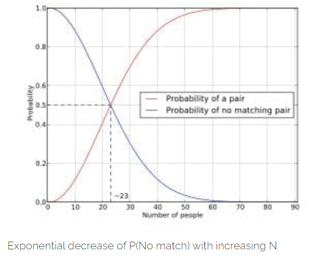 The Birthday paradox has turned tables in cryptography and in a more generic sense applies to hash functions: the expected number of N-bit hashes that can be generated before getting a collision is not , but rather only