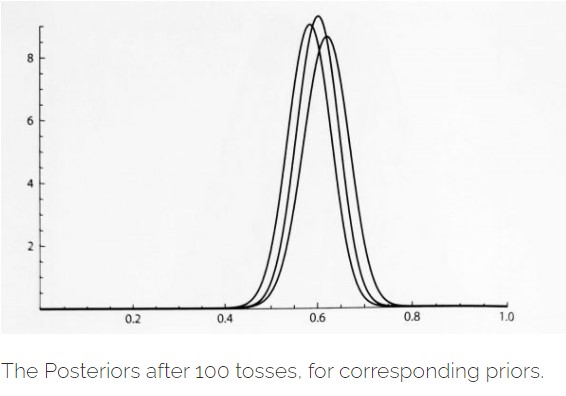 Suppose, we have 62 heads in 100 tosses. The updated densities from our uniform, symmetric, and skewed priors doesn’t show much difference. Bernoulli’s inference from frequency to chance doesn’t look too bad here, but now we know what assumptions we had to make to get that result.